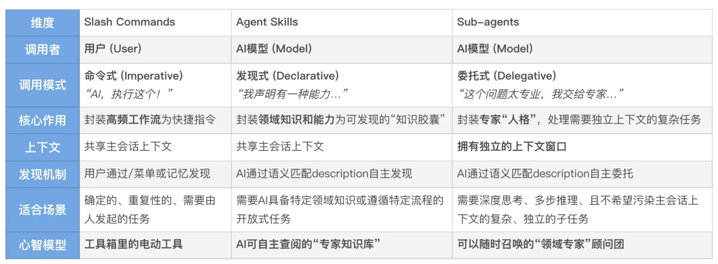 指令(如 Slash Command):是一个"祈使句"。它由用户发起,明确地告诉 AI"去做这件事"。例如,/review-go-code。
